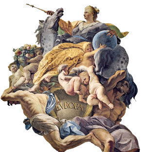 Ce fragment représente l’Europe ; la fresque comporte aussi des allégories de l’Amérique, l’Asie et l’Afrique.